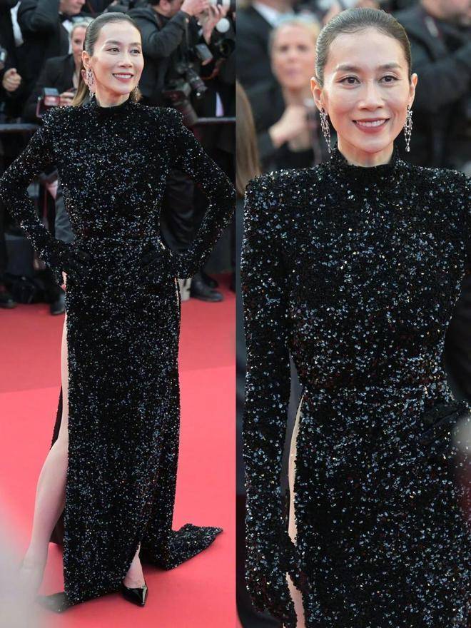 温峥嵘的造型虽然惊艳,却暗藏风险。在上台阶环节,由于礼服紧身且裙摆偏短,她每走一步都小心翼翼,裙摆随风飘动时甚至能隐约看到内衣轮廓,网友纷纷在弹幕中紧张提醒"姐姐走慢一点"。能在47岁保持如此身材,离不开她的自律——她曾在直播中透露,每天早上6点起床练瑜伽,晚上基本只吃水煮菜,手臂上的肌肉线条就是最好的证明。